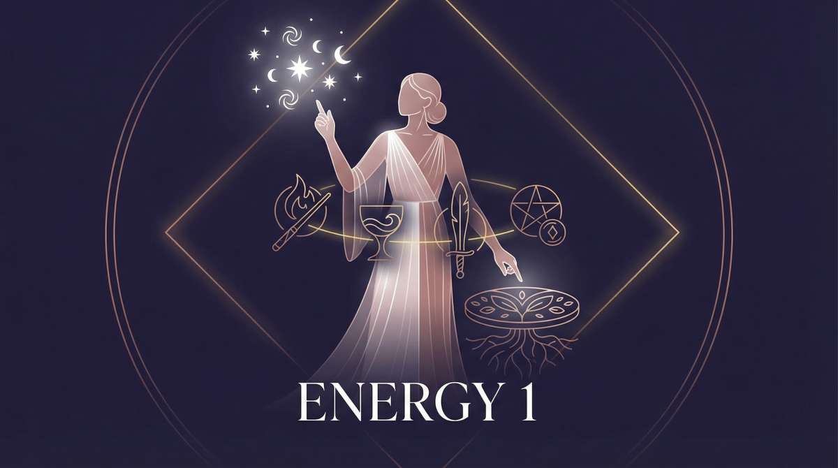 Energy 1 is the frequency of pure manifestation. The Magician stands at the crossroads between thought and form, between vision and reality, with one hand pointing to the heavens and the other to the earth. As above, so below. This is the energy that says: I have everything I need. I can make this happen.