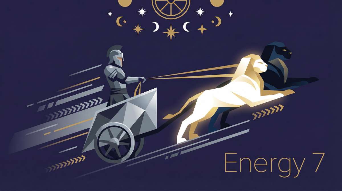 Energy 7 carries the frequency of willpower, momentum, and mastery. A warrior in motion - not charging wildly, but driving forward with focused intention. Two opposing forces pull the chariot, yet the driver holds the reins with absolute control. This is the energy that says: I will move forward. I will master these contradictions. I will triumph through discipline and will.